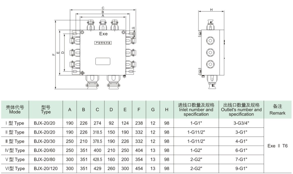 ●防爆標(biāo)志:ExeT6、Exd ll BT6、Exd ll CT6